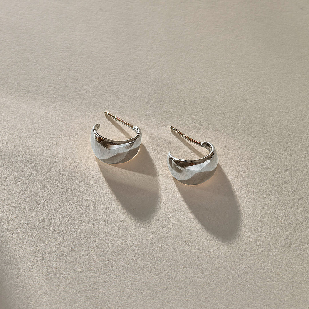 Our Faro Hoops, sculpted in sterling silver, offer a softly rounded, huggie-style silhouette. Like small crescents of light, their polished curves reflect a luminous glow that shifts beautifully from day into night. Both classic and contemporary, they embody modern elegance—an endlessly wearable staple designed to elevate every look.