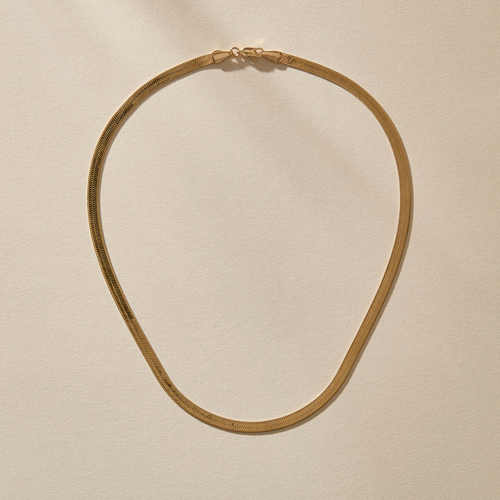 This gorgeous and substantial 4.5mm, 14k solid gold herringbone chain frames the neck and can be worn alone or layered with other necklaces.